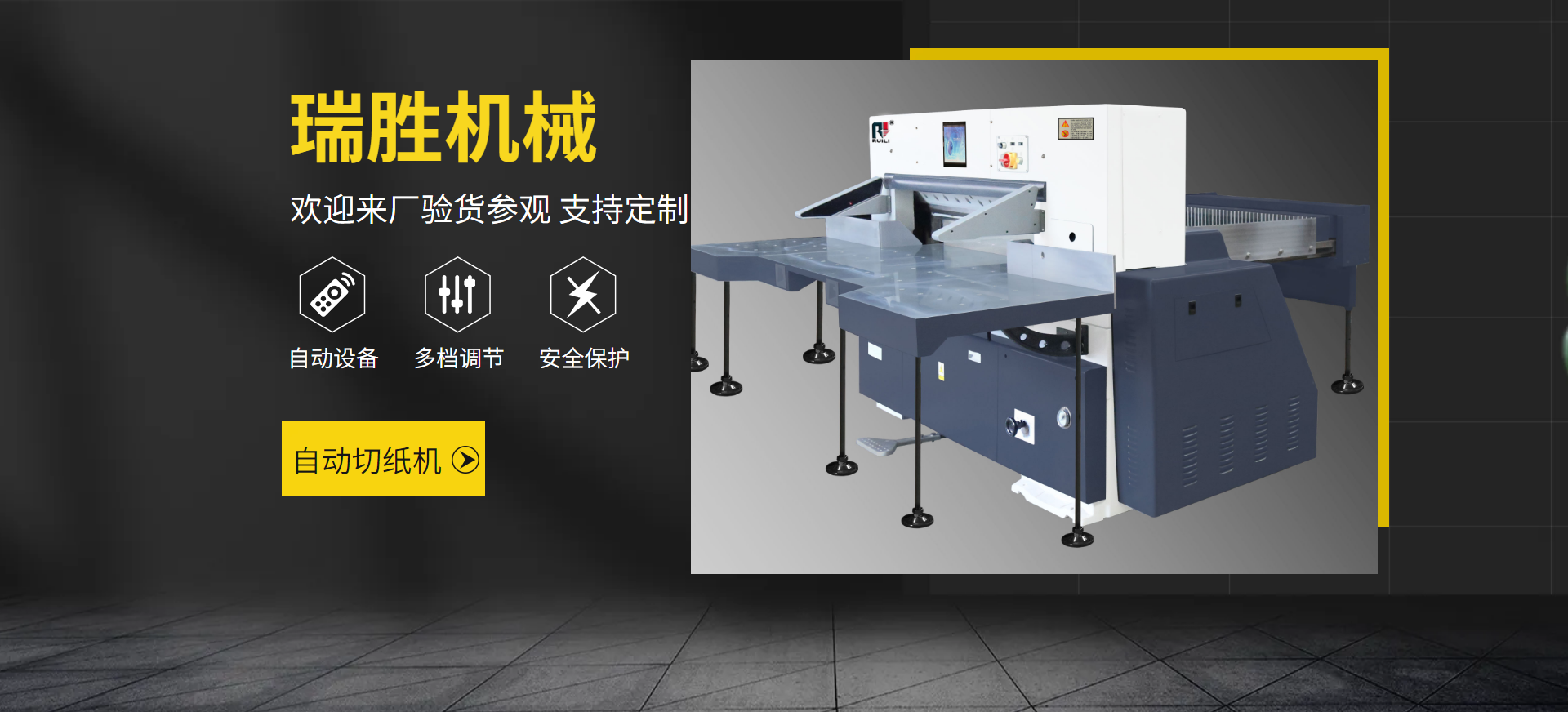 瑞安市瑞勝機械有限公司是一家專業集“生產、銷售、服務”于一體的印刷包裝機械企業;有二十余年專業制造切紙機的經驗,在切紙機行業中享有較高聲譽。研制出集光、機電、液為一體的高性能高品質的切紙機系列產品,主要產品有電腦切紙機,雙液壓電腦切紙機,雙導軌數顯切紙機,快捷式壓痕機系列,覆膜機、上光機、燙金機等系列產品。